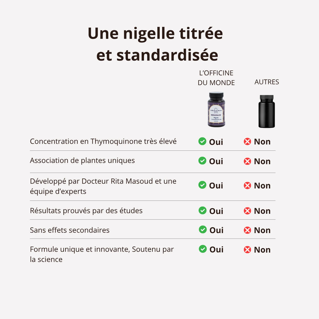 - La Thymoquinone présente dans la nigelle aide à stabiliser les variations hormonales liées à la ménopause.