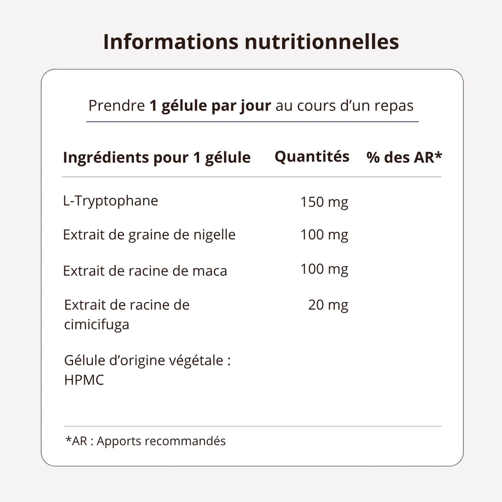 Ingrédients pour 1 gélule : Nigelle dosée à 20mg de Thymoquinone, Maca, Cimicifuga, L-tryptophane, Gélule d’origine végétale : HPMC.